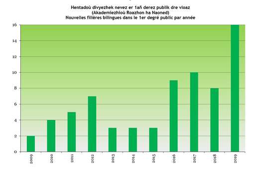 Evit ar wech kentañ en istor ar c’helenn divyezhek ez eus bet digoret 17 lec’h nevez er c’hentañ derez, 16 anezho er publik. Biskoazh ne oa bet kement a zigoradurioù (e 2017 e oa bet 10 digoradur, ar sifr uhelañ e oa betek-henn). Frouezh al labour bet boulc’het war-zu an ensavadurelaat eo. Meur a dra zo deuet da greñvaat an tu-se er bloavezhioù tremenet : krouet eo bet an OPAB e 2010, al lezenn Adreizhadur ar skolioù e 2013 he deus lakaet “ar c’helenn divyezhek da vezañ an tu-kreñv warnañ” (mellad L 312-10 Kod an Deskadurezh) hag an Emglev Stad-Rannvro 2015-2020 a zo ganet diwarnañ ur steuñv diorren daouvloaziek da brogrammiñ an digoradurioù er publik.