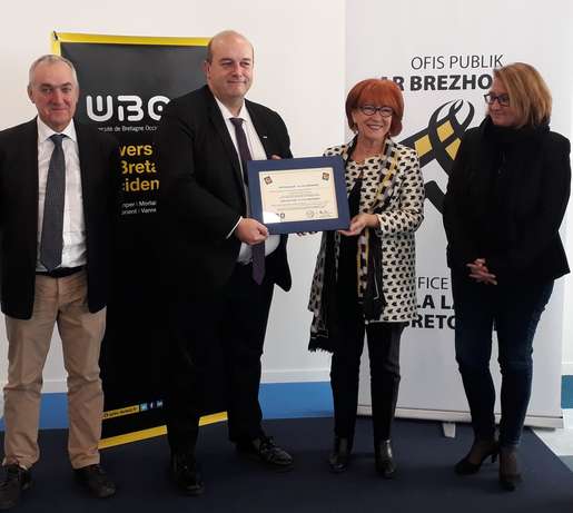 Gant an it. Lena Louarn, besprezidantez ar C’huzul-rannvro karget eus yezhoù Breizh ha besprezidantez an OPAB eo bet roet al label a live 1 eus an emglev Ya d’ar brezhoneg d’an ao. Matthieu Gallou, prezidant Skol-veur Breizh-Izel, dirak an ao. Ronan Divard, mestr-prezegenner ha karget da gas an emglev da benn hag an it. Marine Le Gall-Ely, besprezidantez SBI.